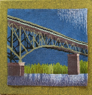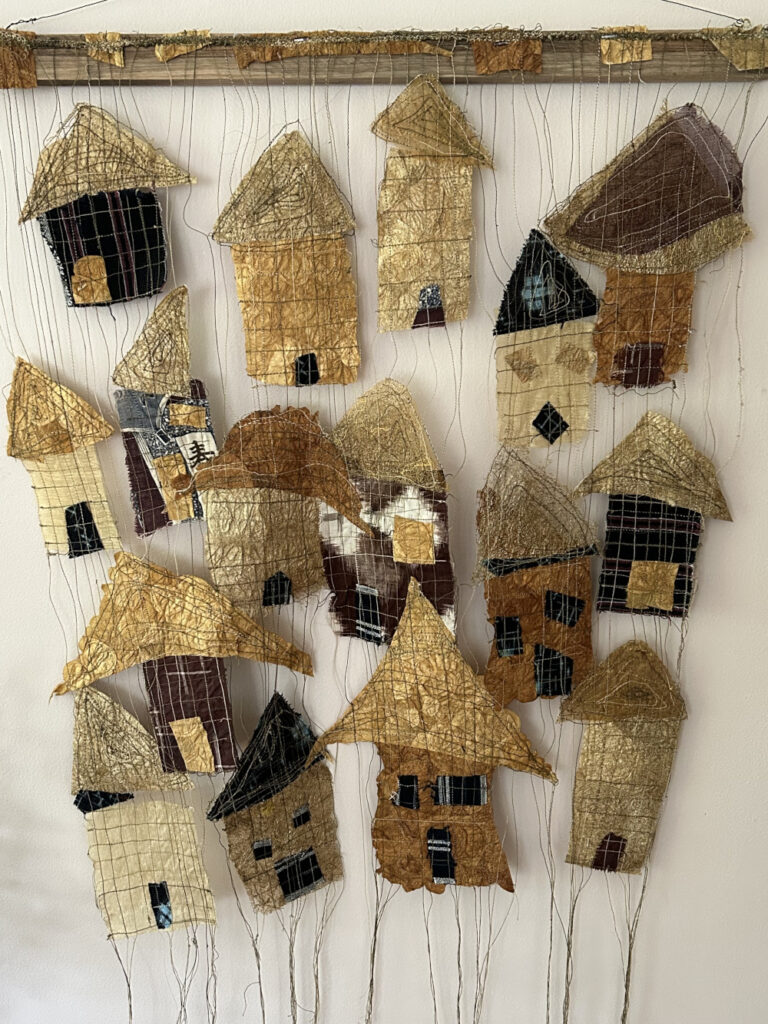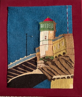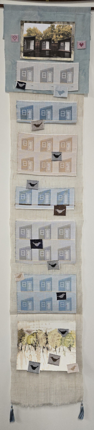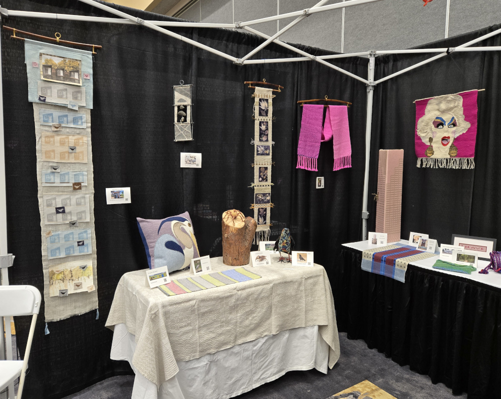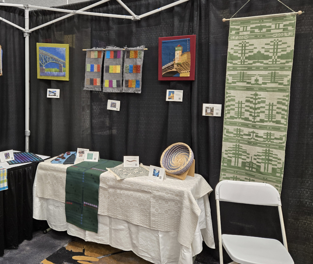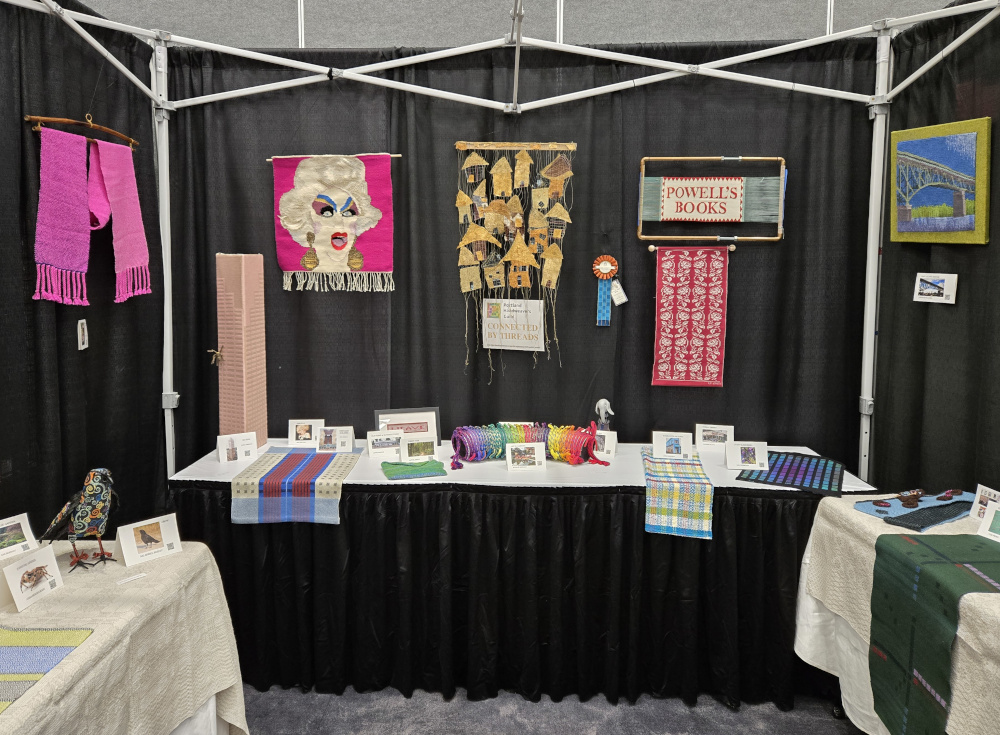 “Connected by Threads”, the name of this piece, describes the community of fiber artists in Portland Handweavers Guild. The inspirations for the works of art in our guild’s display booth at the 2025 conference of the Association of Northwest Weavers’ Guilds were chosen by individual artists and represent the wonderful and quirky places and things that make Portland Portland. Our collection includes a wide range of fiber arts.