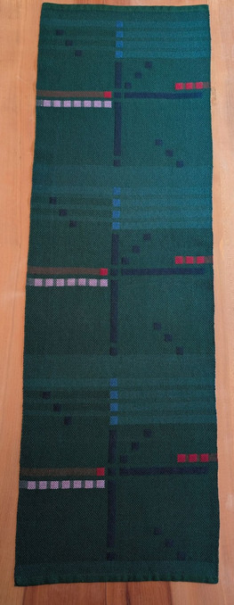 To develop this table runner, Tim studied a sample of the original carpet and made a 16-shaft Summer and Winter pattern. He wove it on an 8-shaft Schacht Baby Wolf loom, which required significant hand manipulation due to it being short 8 shafts. The piece is woven with 5/2 and 10/2 perle cotton, capturing the geometric style of the carpet in a nod to Portland’s unique cultural symbol.