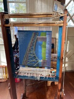 Phoebe wove this tapestry on an Aubusson upright loom using cotton warp and wool weft. The sett was 13 portee, about 10 epi. The size is 13 x 13 inches, 16 x 16 mounted.